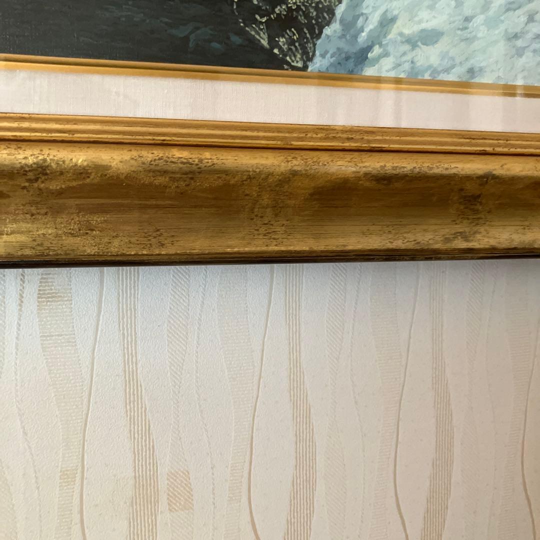冬の風景を描いた細密な日本画、金色のフレーム付き。額縁に一部変色あり