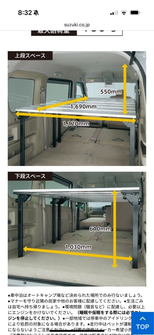 スズキ純正の2段ベッドセットです。4人が横になって足を伸ばして寝れるというのが売りです。セット内容は、ベッドキット、上段用ベッドマット、乗降ボードの3点です。合計222640円します。
