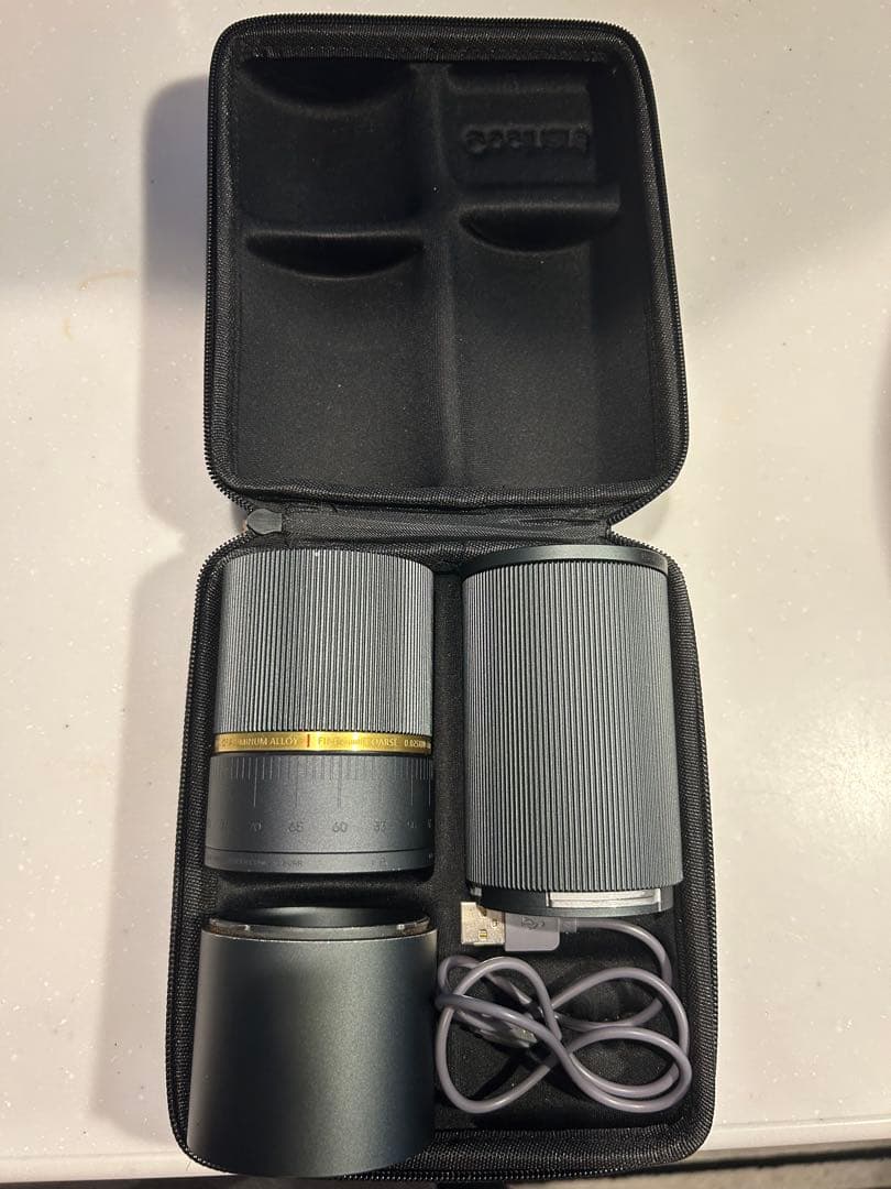 調整可能な挽き具合を持つグレーの手挽きコーヒーミル、ケースとUSBケーブル付き。