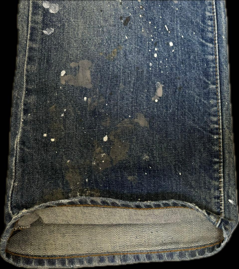オーバーデザインのデニム加工は裾に関して加工元のデニムから施していないので、他の部位の加工と比べて裾の加工が少なくて浮くことがあります。